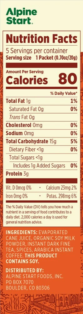 Inspired by world travels, Alpine Start Dirty Chai Latte instant coffee blends chai, black tea and soy milk with 100% high-altitude Colombian Arabica coffee for a sweet, spicy and aromatic experience.