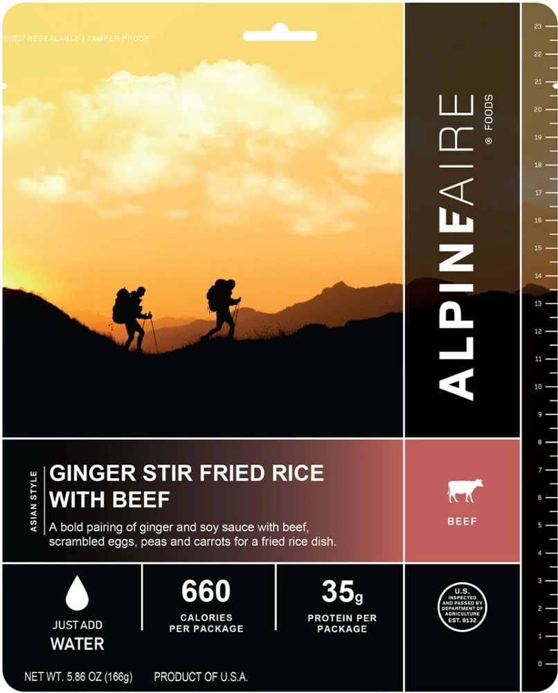 Craving fried rice off the grid? Enjoy a post-hike dinner of AlpineAire Foods Ginger Stir Fried Rice with Beef. It pairs ginger, soy sauce and beef with scrambled eggs, peas and carrots.