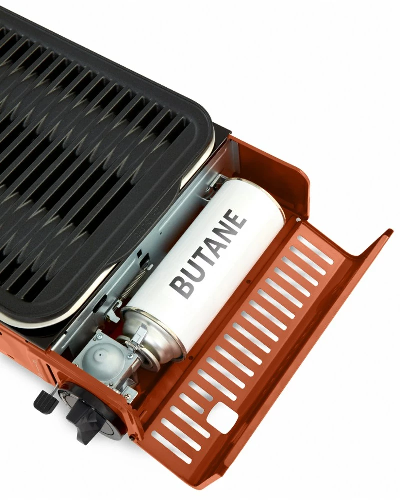 - Integrated fuel compartment fits 8 oz. butane canisters for space-saving convenience