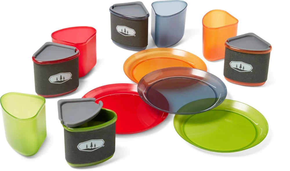 - Made from BPA-free polypropylene, the complete lightweight tableware system includes 4 nesting bowls, 4 insulated mugs and 4 plates in an ultra-compact mesh stuff sack