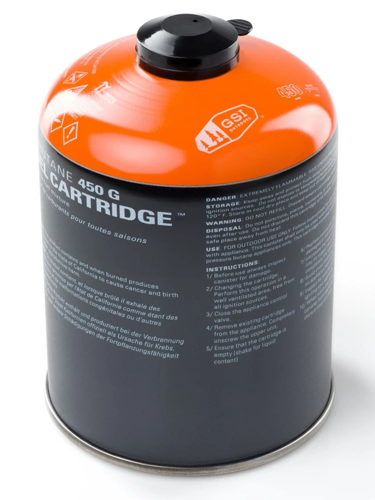 Delivering clean combustion no matter how much fuel is left, the all-season GSI Outdoors Isobutane 450 g fuel canister is perfect for long trips or cooking for a crowd.