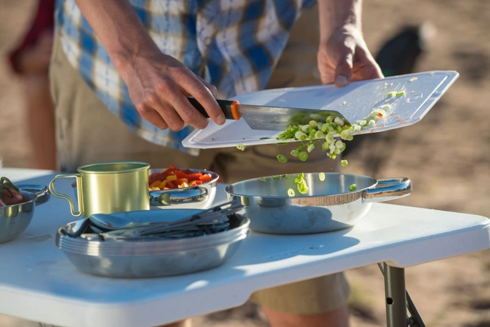 - Compact stainless-steel blades are rockered for kitchen prep and other camp use