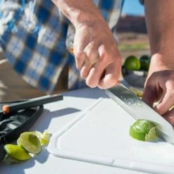 - Folding cutting board is easy to carry and unfolds to reveal a generous 12.6 x 9 in. prep surface