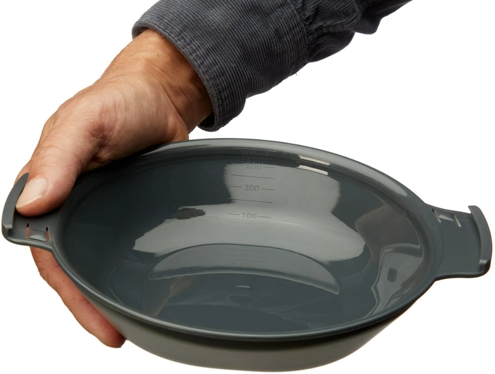 - Side handles on the plate and bowl are easy to hold when a table isn’t available