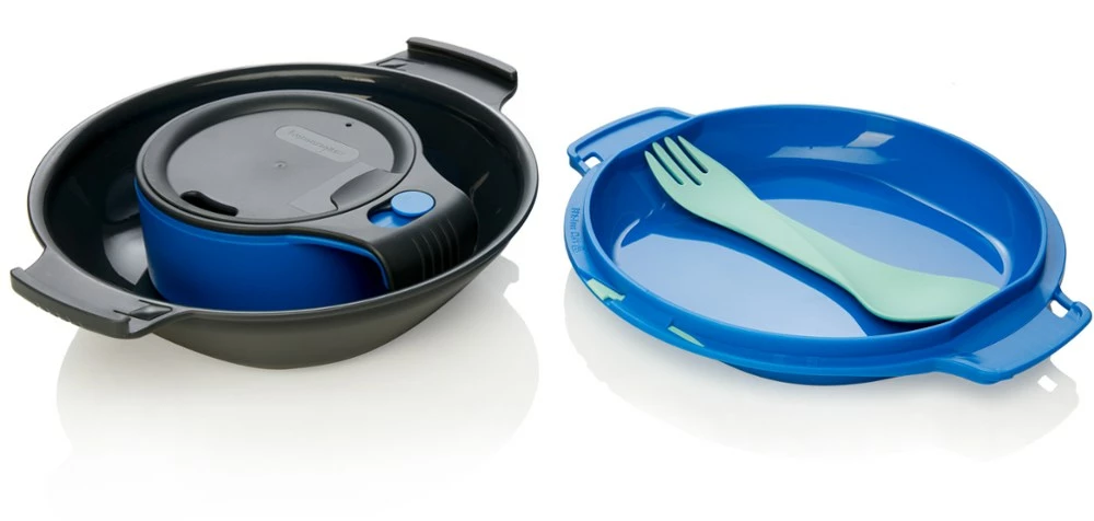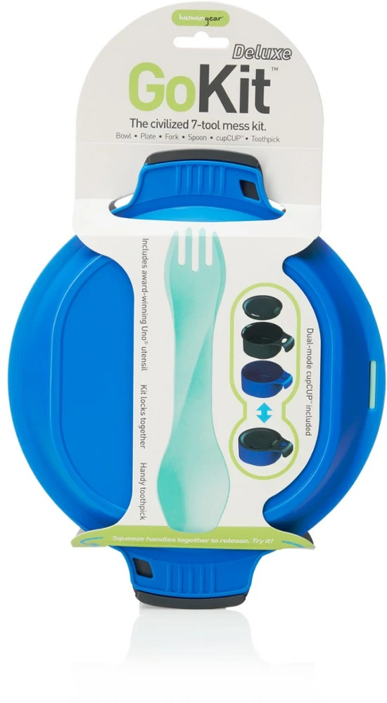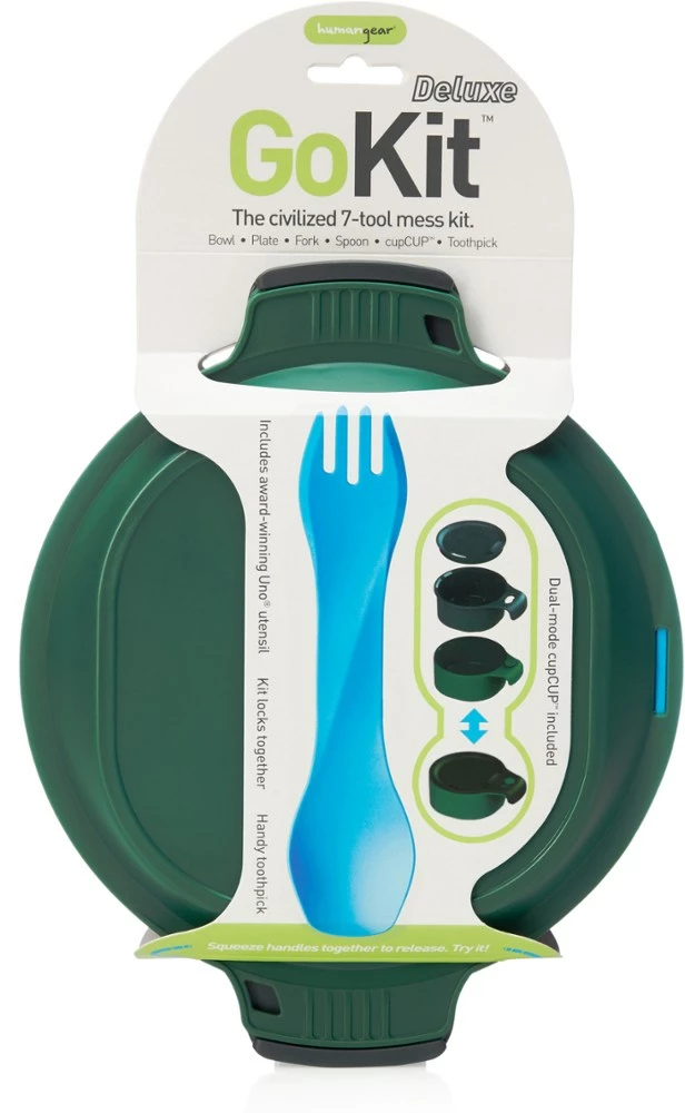 Bringing together the basics—a plate, bowl and GoBites Uno spork—and adding the cupCUP dual-mode insulated mug, the humangear GoKit Deluxe 7-tool mess kit equips you for gourmet backcountry meals.