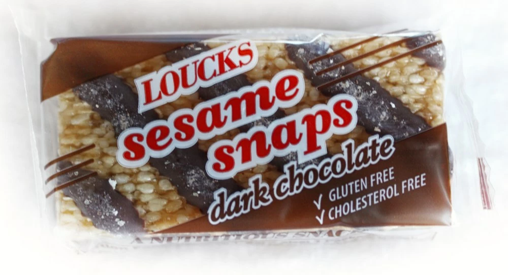 Enjoy these sweet and nutty Loucks Sesame Snaps made of roasted sesame seeds and dark chocolate.