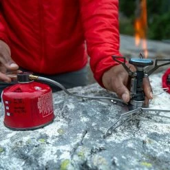 - Remote valve and fuel line move the flame control away from the stove and pot, making cooking adjustments easier and more secure (no sticking hands under a full, boiling pot)