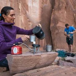 - Perfectly sized for 2 people, the included 1.8-liter pot nests all system components for easy packing; it features a heat exchanger and insulating cozy with handle