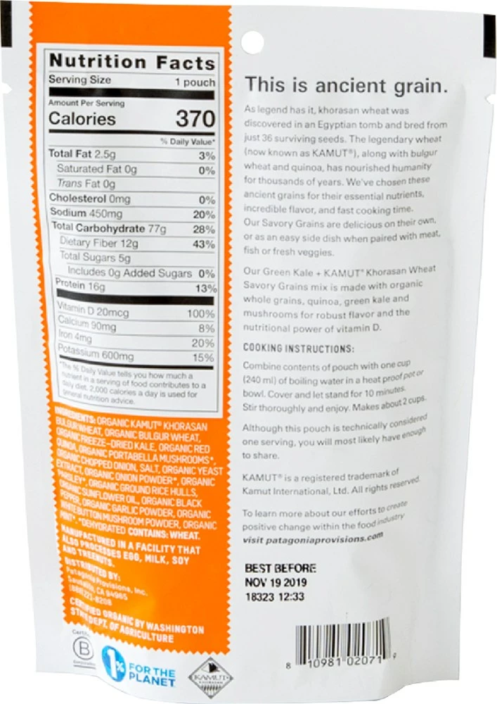An easy and delicious blend of organic ancient grains, green kale and mushrooms, Patagonia Provisions Savory Grains Green Kale + Kamut Khorasan Wheat is ready in 10 short minutes.