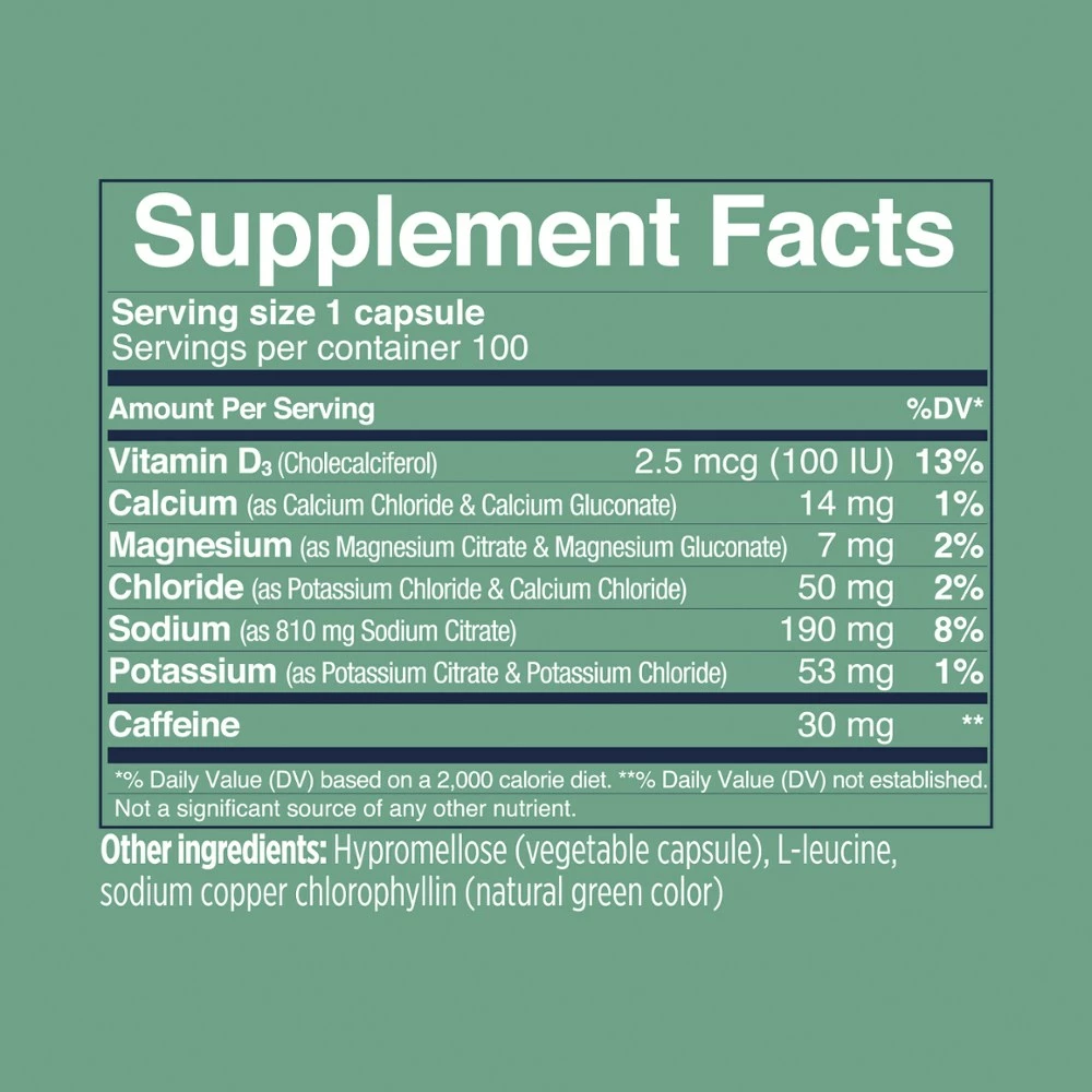 - Each capsule contains 190 mg sodium, 53 mg potassium, 14 mg calcium, 7 mg magnesium and 30 mg of caffeine; contains 100 IU of vitamin D to help the body absorb calcium